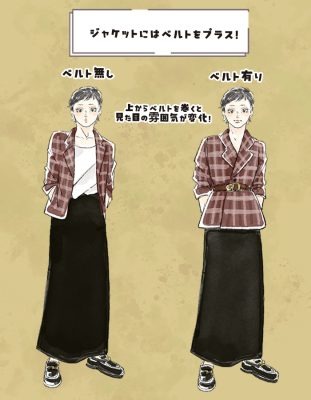 ベルトはジャケットの上からONするのが、今っぽくて目新しい着こなし。ジャケットはボタンを閉じてインナーを見せないようにしましょう。ウエストのくびれている部分にベルトを巻きつけて、オールインワンやワンピース風に着こなすと、アイテム自体は大きく変えていなくても見た目の雰囲気が大きく変化します。