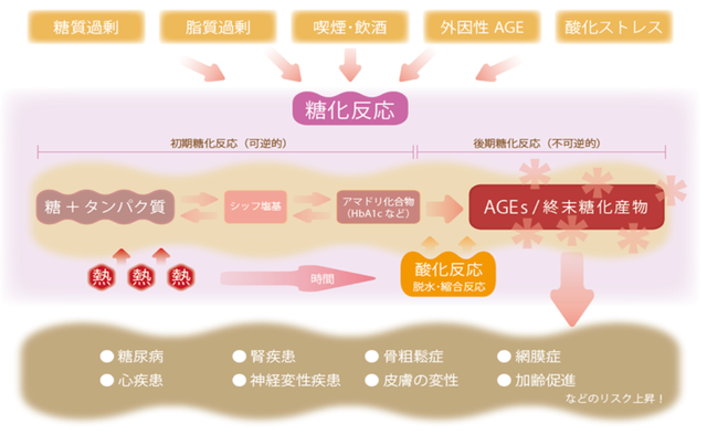 体内に余分な糖がたくさんある、つまり血糖値が高い状態だと、血中で糖とタンパク質が出会う機会が増えます。すると、カルボニル基(-CHO)とアミノ基(-NH2)が自然に結合して、AGEs(エージーイー:終末糖化産物)という老化物質を生成します。この「糖化」の状態は「体がコゲる」とも例えられます。生成されたAGEsは分解されにくいため体内に蓄積し、全身の様々な組織にダメージを与え、老化や病気の原因となるというわけです。
