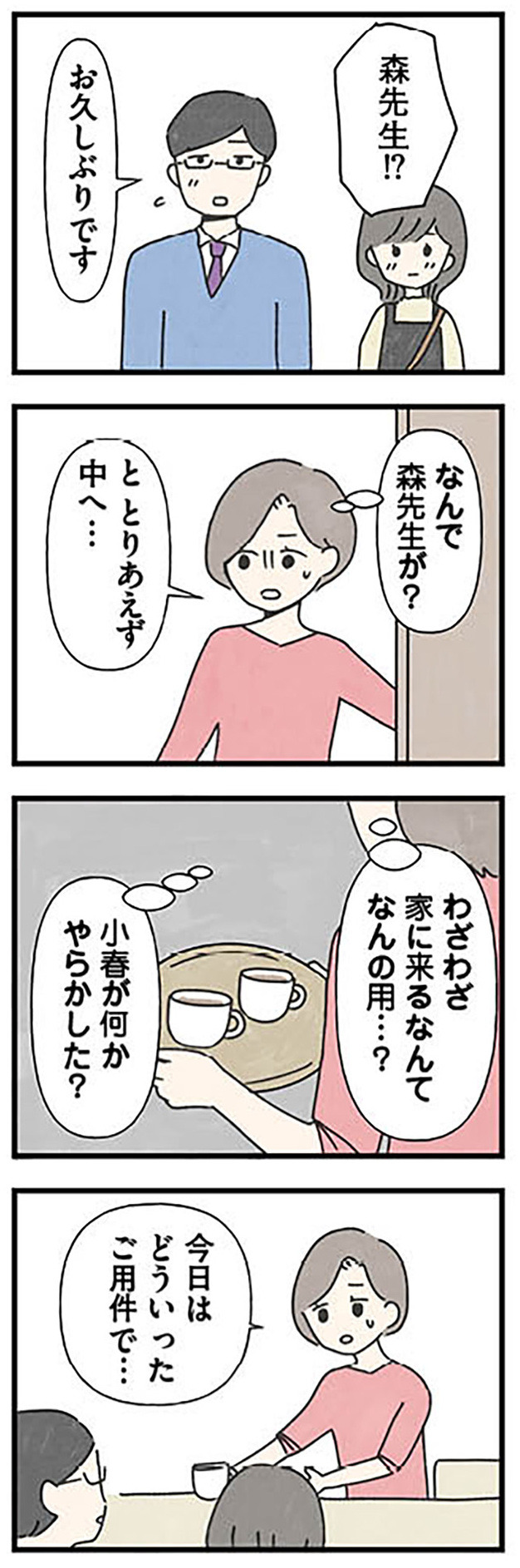 ある日、娘の成績が落ちていることに気付いた真美は、塾に通わせることに。小春を連れて塾へ行くと、娘の小学生時代の副担任・森先生に再会する。