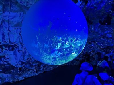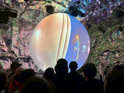 パビリオンは大きく4つのゾーンに分かれています。入場してすぐの空間には、輝く真珠のような大きな球状スクリーンが。最初はサンゴ礁の海中が映し出されていますが、ストーリーが始まると一転して3人のキャラクターが登場。