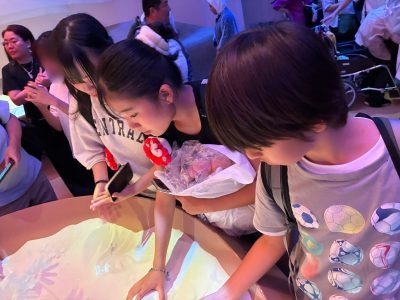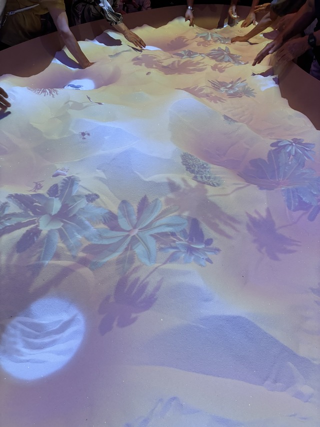 次のゾーンには、どーんと中型ボートくらいのサイズで再現された砂漠が。砂に投影された影を掬ったり、無心に砂に手を入れたり。時折さそりの影がさっと横切ります。