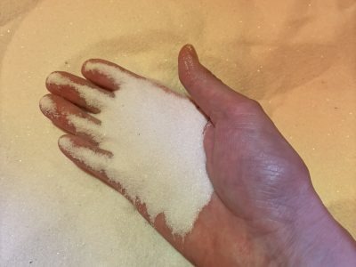 私、砂漠の砂って、ベージュ色っぽいイメージを持っていました。だから、手に取ってみても「こんなに白いの? そしてこんなにサラサラなの!?」と驚くばかり。ほんのり冷たくて、そして重たい。掬って戻してを繰り返しても、手に砂粒が残らないことにも驚きました。