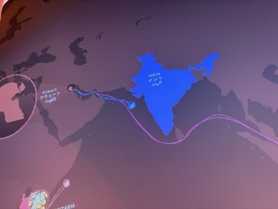 蓋の色、赤い光が日本を出て海へと漕ぎ出し、クウェートに至るまでの道筋が示されました。