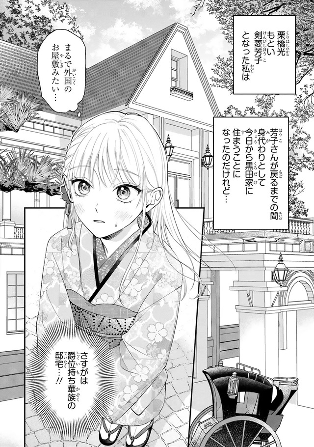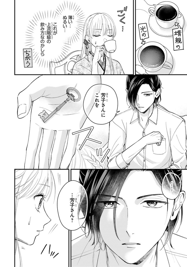 和モダンな世界を舞台にした秘密のロマンス! 家族経営のカフェーが全焼し、窮地に立たされた栗橋光。そんなとき、成金の資産家・剣菱家から、駆け落ちした一人娘・芳子として、華族である黒田家の嫡男・靖親の婚約者のフリをしてほしいと頼まれる。光は家族のために、靖親の婚約者としていっしょに暮らしはじめるが…。「第1回フレックスコミックス漫画原作大賞」金賞を受賞した極上のラブストーリーをお楽しみください!