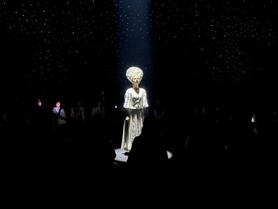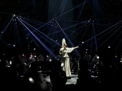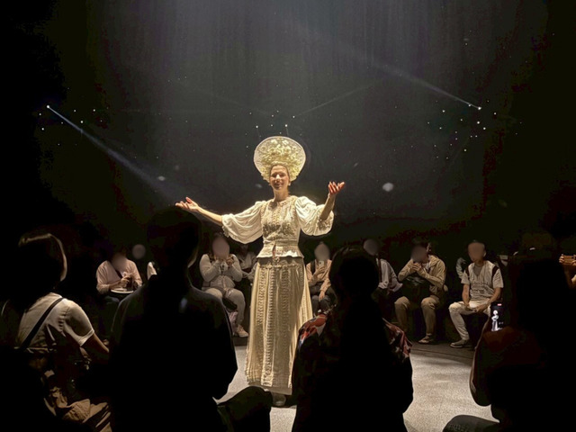 「今回の歌い手の純白の衣装は、この万博のコンセプトに合わせてハンガリーでいちばん有名なデザイナーが特別にデザインしなおしたもので、とても好評ですから会期後もどこかで展示ができたらいいなと思っています。ハンガリーの伝統模様をすべて白で表顔した、肌の露出のないエレガントなデザインはぜひご覧いただきたいです」