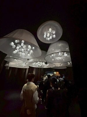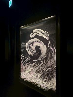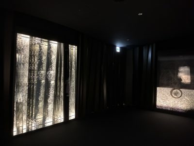 入館し、廊下を進むと、その先のほの暗い空間に白いガラスアートが浮かび上がります。