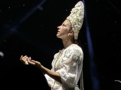 中央に純白の民族衣装を着た女性が立っています。簡単な挨拶に続き、彼女がひとりで朗々と歌い始めます。