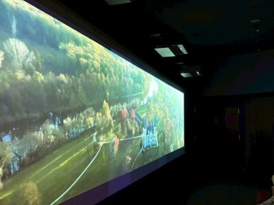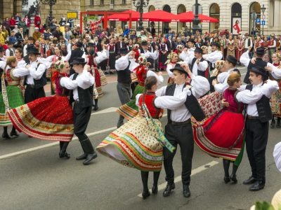 このあと出口までの間にハンガリー各地のみどころを圧巻のクオリティで流す美しいビジョンも設置されています。そこにも多数映し出されますが、ハンガリーの民族衣装は実は「赤」なのだそう。日本の1/4の国土ながら民族衣装のバリエーションはじつに豊富、似たものが「ひとつもない」ほどで、この地方のこの村ならば髪飾りはこれ、未婚はこちら既婚はこちら、スカートはどれを重ねる、エプロンはこの地方と細かく決まっていると言います。一例が下の写真、ブタペストの春祭りです。