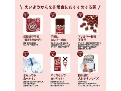 ●「防災用ようかん」:長期保存が可能なうえ、手軽にカロリー補給ができるため