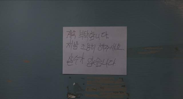 併せて届いたカットでは、これらの張り紙を作成した可能性が高いと思われる、504号室の住民男性の姿が確認できる。真夜中にインターホンを鳴らして、604号室にいるソ・ジュヨンを訪問する不気味なシーンも捉えられており、不適に笑う光景が不気味だ。しかも彼は、包丁を手にしながら訪問していることが予告編で明らかとなっており、ジュヒの失踪に関わっている可能性もある。怪しい存在だ。