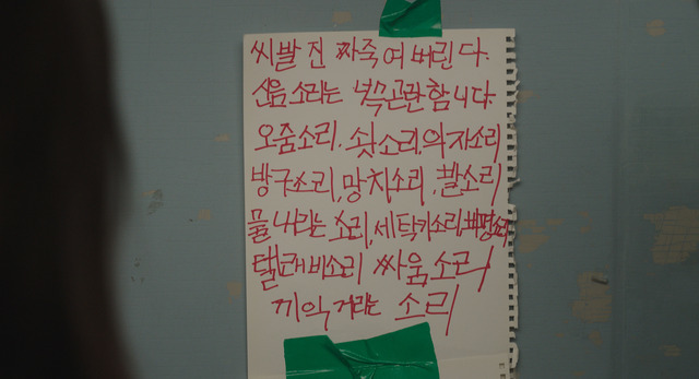 ただ別カットでは、赤いマジックで殴り書きされた張り紙が残されており、「ぶっ殺すぞ うめき声 椅子の音 足音」といった物騒なメッセージが多数羅列されている。明らかに険悪なムードが漂っており、異様さを感じ取れる。