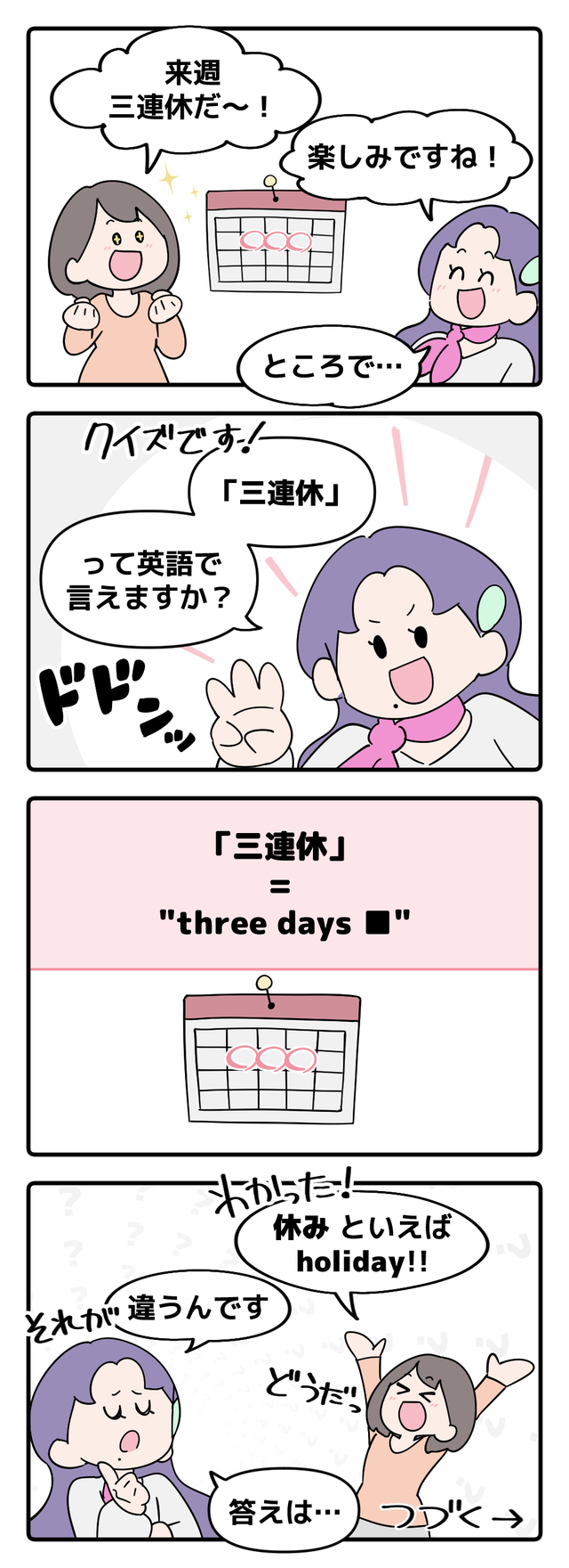 「英語嫌いな日本人をなくしたい!」海外生活や添乗員経験、そしてバイリンガル子育て中の英会話講師・Mrs.服部が、身近な英語表現を漫画&クイズ形式でお届け! 「間違ったら恥ずかしい」じゃなく「伝わればOK」。使えるフレーズをマンガで学びましょう!