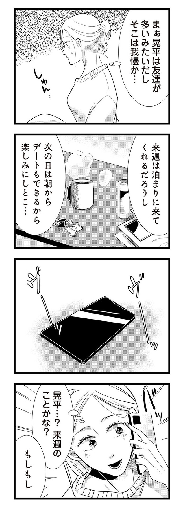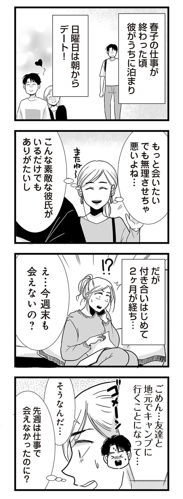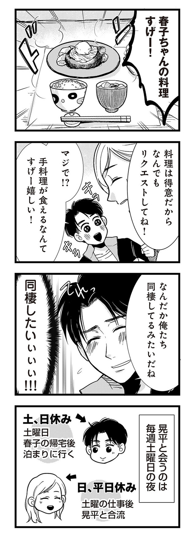 ところがある日、晃平から「これからは平日に会わない?」という謎な提案が…。胸に不安を抱えつつも彼を信じようとする春子。