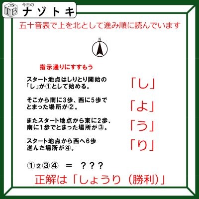 あとは同じ要領で指示に従っていき文字を特定していきましょう。正解は「しょうり(勝利)」でした。
