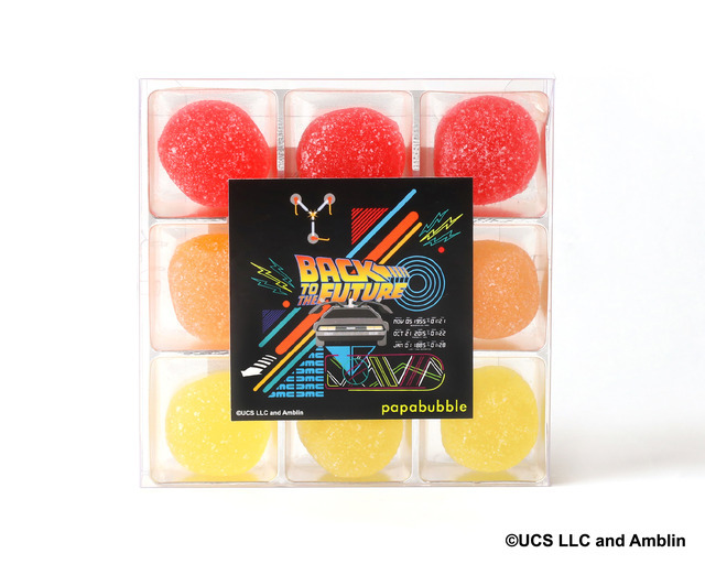 赤(コーラ)、橙(エナジードリンク)、黄色(ジンジャーエール)の3色を各3個ずつ詰め合わせ、あのタイムトラベルの炎のグラデーションが浮かび上がる。ひとつ食べるごとにスピードを増していくような刺激感。3種類を続けて味わえば、まるで映画に登場する車のエンジン音とともに“タイムサーキット”が作動するかのよう。開けた瞬間からワクワクが加速する、BTTFファンに贈る特別なグミとなっている。