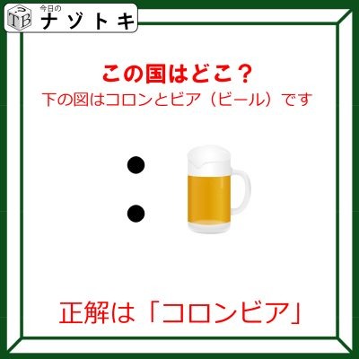 それぞれの読み方を考えていきましょう。左の「:」は「コロン」と読みます。右のイラストは「ビール」ですがそれだと「コロンビール」となり、国名にはならないですね。別の言い方にしましょう。それは「ビール」ではなく「ビア」です。