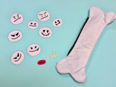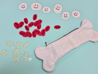 これは、白血病の説明で使うツールですね。血液は骨で作られるので、骨型の袋の中に、血液の成分を模したものが入っています。まずは健康な血液。白血球はニコニコ笑って、正常に機能してばい菌をやっつけてくれる状態を表しています。