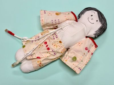 抗がん剤治療などにつかうCV(中心静脈)カテーテルを通したキワニスドール。切開する位置や体内でカテーテルが通るルートなども再現し、患者が見たり触ったりしながら理解しやすくなるようにしている。(撮影協力/埼玉県立小児医療センター)