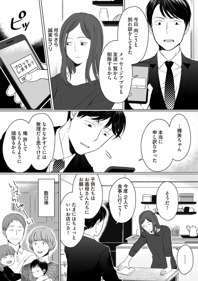 専業主婦の輝美は、ある日夫の不倫に気付く。スマホのトーク履歴を見れば一目瞭然で、夫もすぐに認めた。
