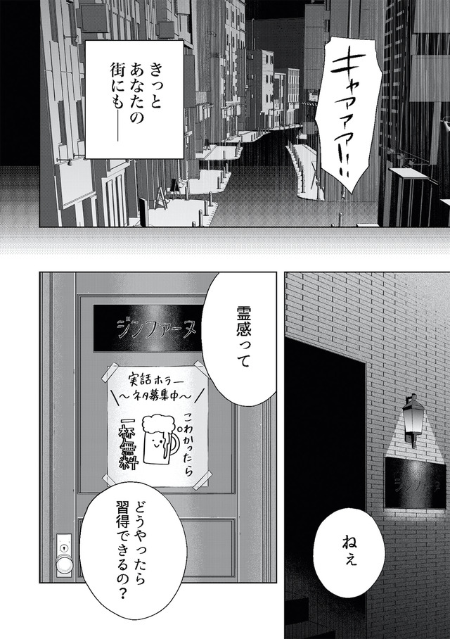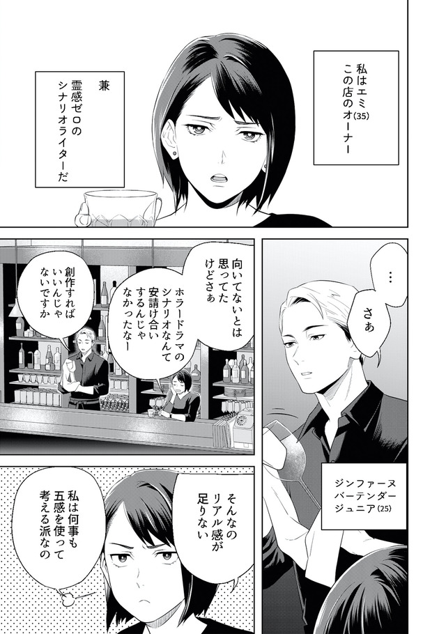 バーを営む霊感ゼロの脚本家・エミ(35歳)。ホラー系連載の締め切りを目前にした彼女は、1杯のタダ酒と引き換えに怪談の“ネタ”を求めていた。