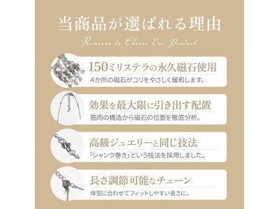 華奢でエレガントなデザインの見た目からは想像もつかない、広範囲にとどく磁石4個使用のネックレス。ギフトボックス、クロス、巾着袋つきで20%OFF中♪