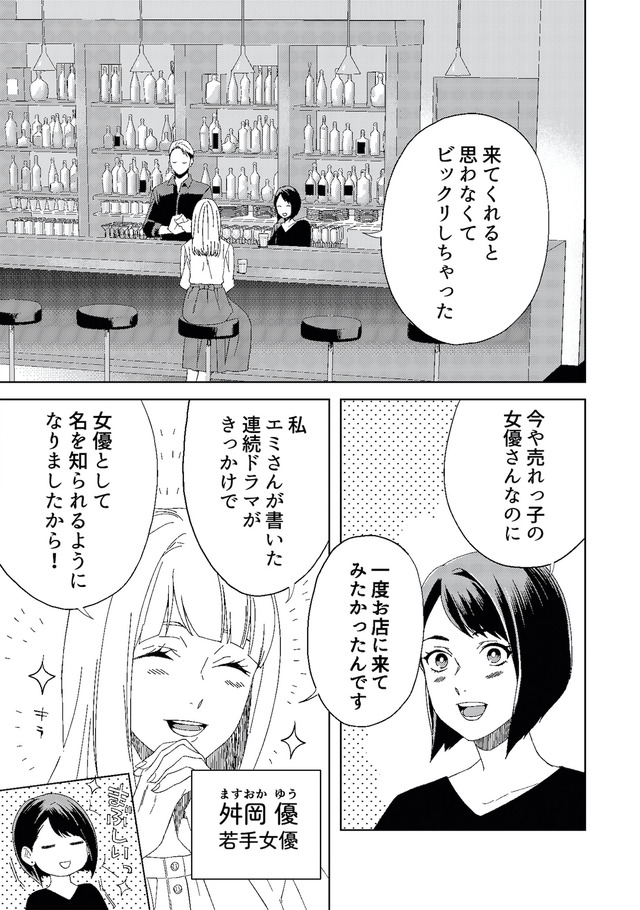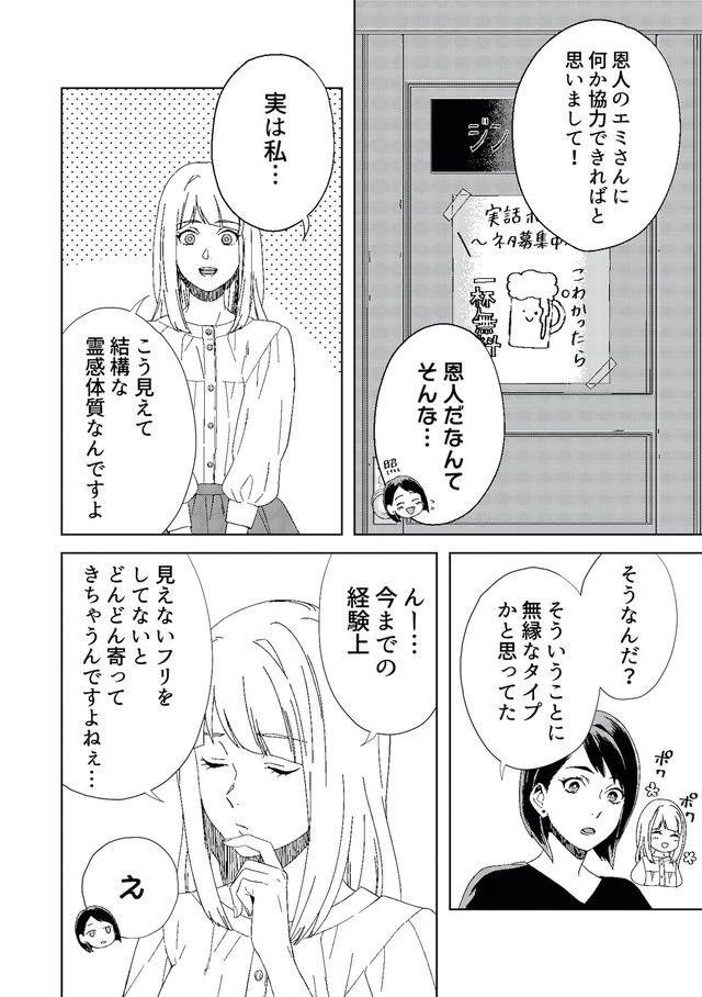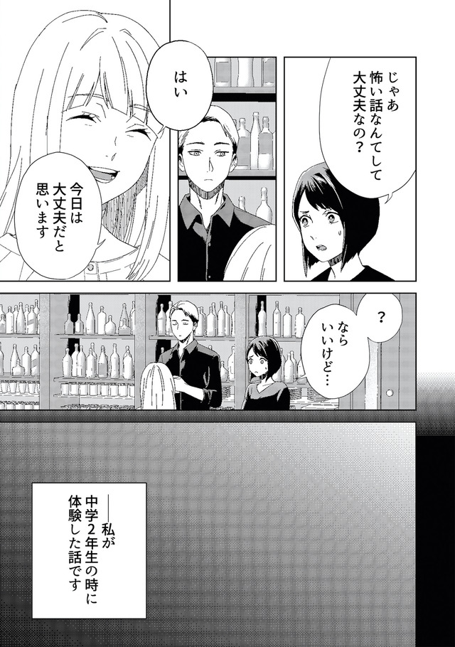 バーを営む霊感ゼロの脚本家・エミ(35歳)。ホラー系連載の締め切りを目前にした彼女は、1杯のタダ酒と引き換えに怪談の“ネタ”を求めていた。