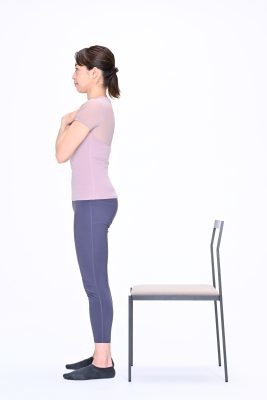 椅子から少し離れて、両脚を肩幅に開いて背すじを伸ばして立つ。胸を軽く引き上げて、両腕を胸で組む。