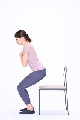 「2、3、4、5」と声に出して数えながら、お尻をゆっくり座面すれすれまで近づける。お尻が座面についたら、さっと1の姿勢に戻り10回くり返す。