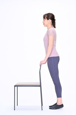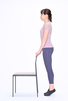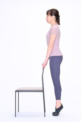 椅子の後ろに、両足を腰幅に開いて立ち、背もたれに両手を添える。