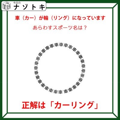 あとは「車」ですが車は英語で「カー」と言います。まとめると「カー」が「リング」になっているということですね。ここまでくれば表されるスポーツは分かりましたね?正解は「カーリング」でした。