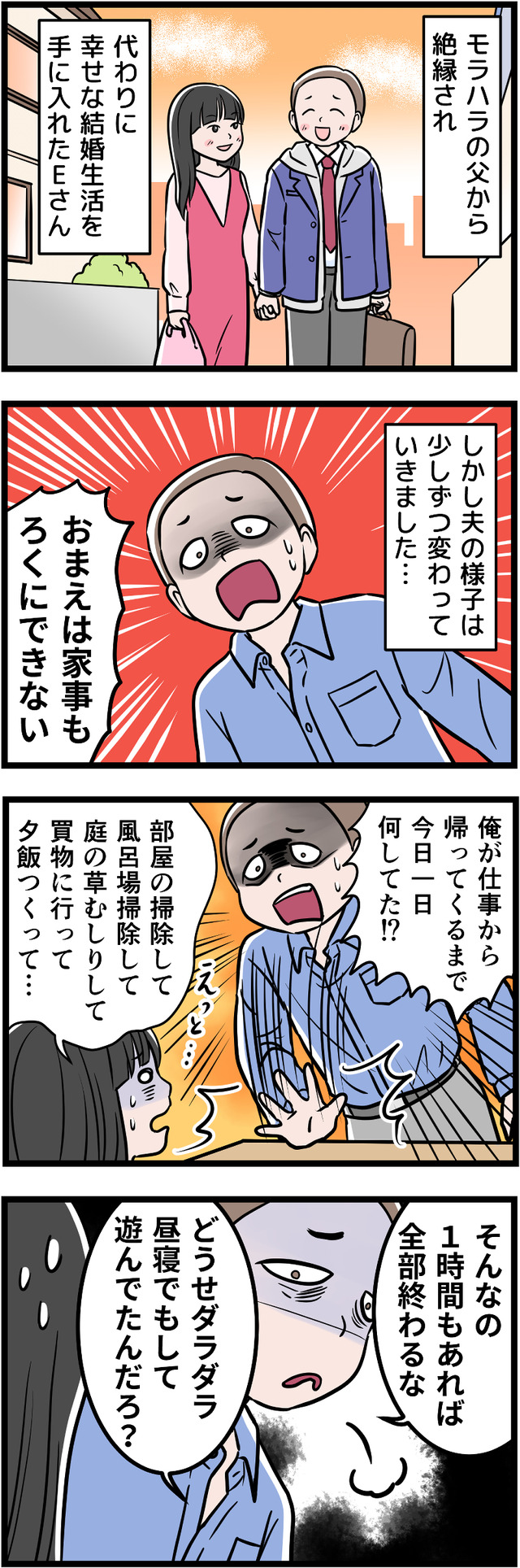 草むしりまでしているのに1時間で済むと言われてしまって、困惑…。でも、これまで父からモラハラされていたEさんはこう思うのでした。