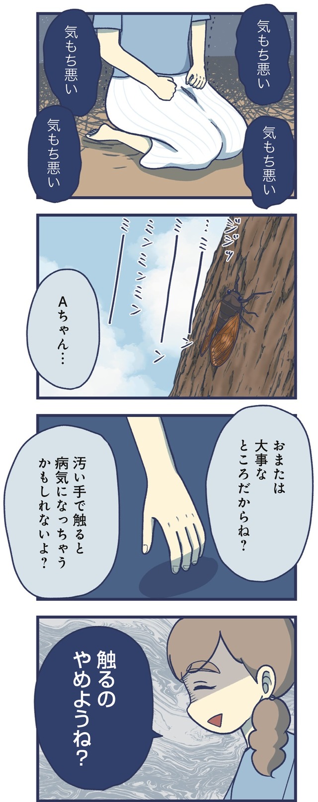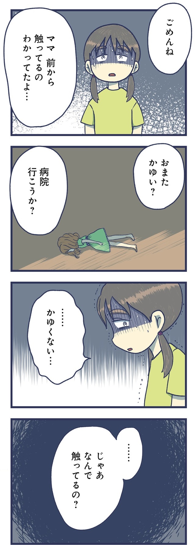 2人目を出産後、甘えてくるようになった4歳の長女。そんなある日、長女が自慰行為にふけっている現場を見てしまい、主人公は大きな衝撃を受けます。ネットで調べても「よくあること」「見守ってあげましょう」という言説ばかりで、母親の葛藤に寄り添うようなものは見当たりません。「娘が気持ち悪い」そう思ってしまう自分に苦しむ日々のなかで、徐々に追い詰められて……。今回は、幼すぎる性の目覚めに葛藤する母娘の苦しみを鮮烈に描いたコミックエッセイを特別抜粋でお届けします。