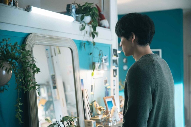 映像では、鏡の前で慎重に眼鏡をかけ、弟の姿に寄せようとする涼。「恵ちゃん、手伝って」と呼ぶ亜子の声に、涼はそっと微笑み、仲良く朝食の準備を始める。正反対の性格の双子という設定もあり、弟は左利き。福士は右利きであり、何度も訓練を重ねたという。弟になり切っている涼は、料理を作りながらも愛おしそうな表情で亜子を見つめる。