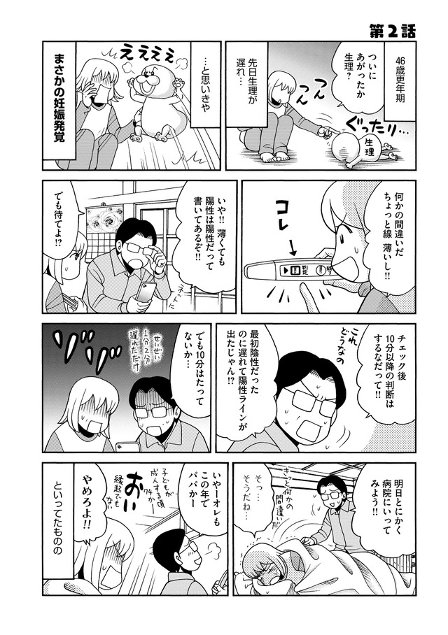 「更年期なめんなよ」生理がこない…閉経か妊娠か、夫にすすめられて妊娠検査薬でチェック!【アラフィフ漫画家 更年期かと思ったら妊娠してました #2】
