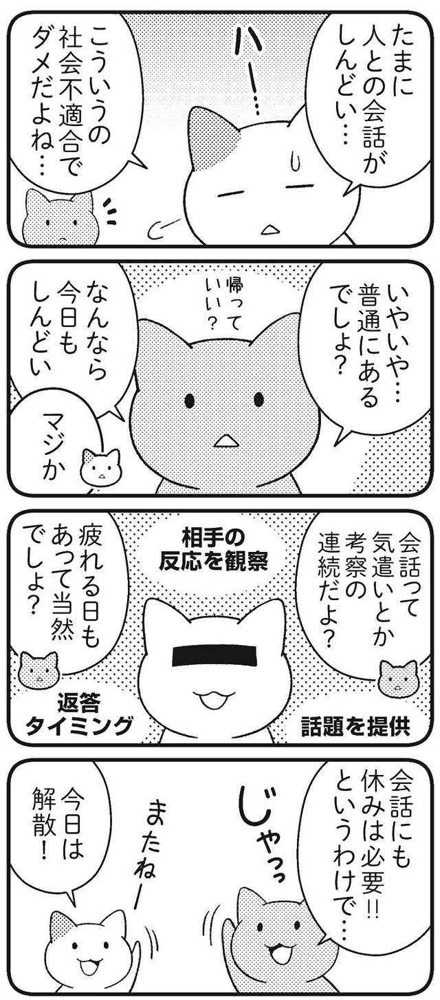 ぶっちゃけ、人との会話は楽しいときも、疲れるときもあります。相手にもよりますが、会話するためには、話題を考えたり、相手の反応を観察したり、相槌を入れるタイミングを計ったり、ちょっと考えただけでも気遣いと考察の連続です。人に気を遣い続けて疲れない人なんていません。