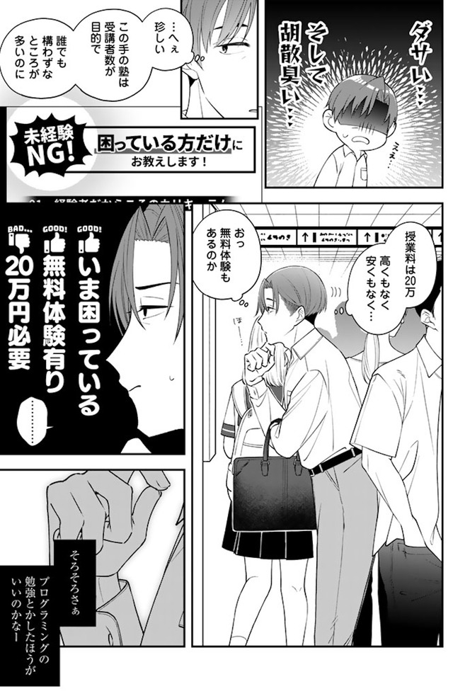 仕事も家庭も迷走中の会社員。駅で“胡散臭いプログラミング教室”の広告に足が止まる【え、社内システム全てワンオペしている私を解雇ですか? #9】