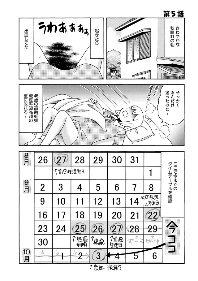8週間で産むか決める…悩みに悩んでいた46歳、突然の出血【アラフィフ漫画家 更年期かと思ったら妊娠してました #8】
