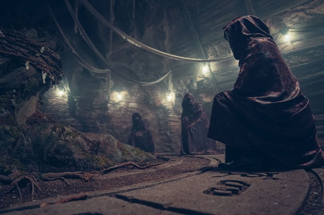 悪魔祓い株式会社の調査能力の高さがうかがえる”壁”や、劇中登場する呪われた家に隠された不気味な古代文字、カルト集団の怪しい儀式の様子など、細部にわたるまでこだわり作り上げられた作品の世界観が伝わるカットとなっている。