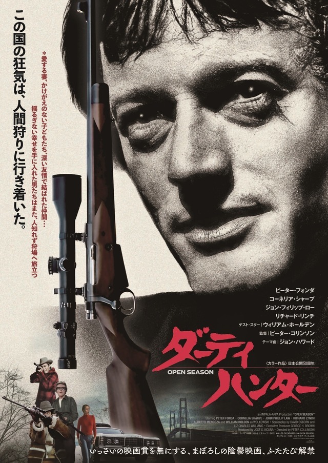 共演に『バーバレラ』のジョン・フィリップ・ロー、『スケアクロウ』のリチャード・リンチ。フォンダとともに満面の笑顔をみせる場面写真での一コマはなんとも歪んだ迫力だ。ハンター3人に目をつけられ、獲物とされてしまうカップルを演じるのは、『セルピコ』のコーネリア・シャープとアルゼンチン映画批評家協会賞を受賞している『ホラー・エクスプレス/ゾンビ特急地獄行』のアルベルト・デ・メンドーサ。ゲストスターとしてウィリアム・ホールデンも出演している。『ダーティハンター』は2026年1月2日(金)よりシネマート新宿ほか全国にて順次公開。