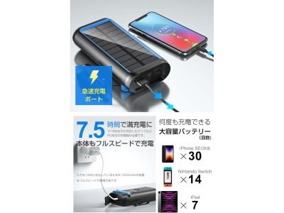 ソーラー充電、手回し発電もできて、停電時に強い! 携帯の充電なら同時に6台が可能。懐中電灯にもなります