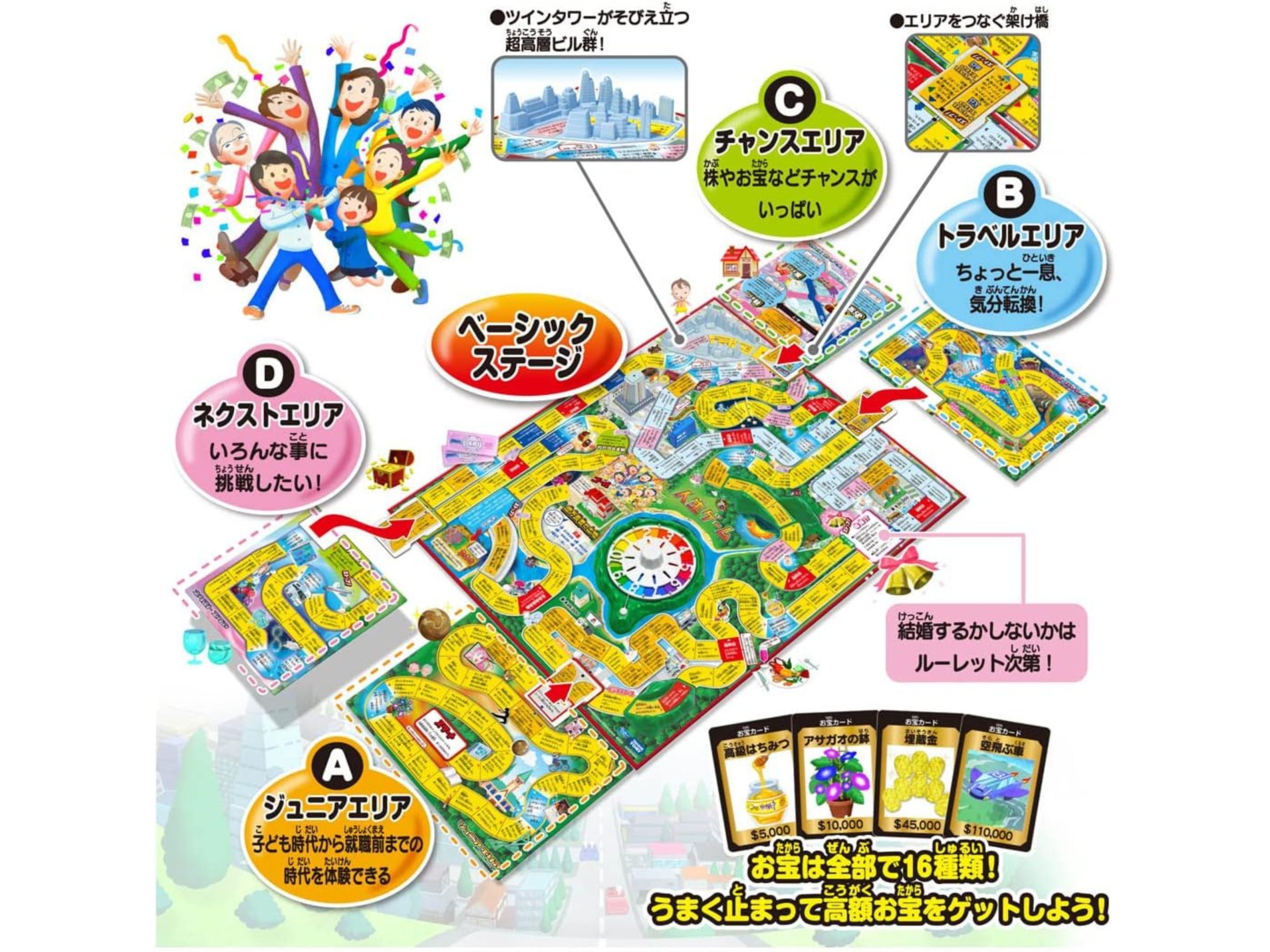 世代を超えてハズせない超定番! 現代版「人生ゲーム」。メインステージのほか4つの追加エリア(ジュニアエリア・チャンスエリアほか)があり、16種類の組み合わせが楽しめます♪