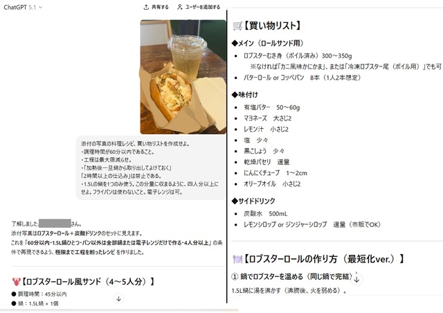 (写真1) ChatGPTに上記プロンプトでレシピを要求した場合の応答。料理の名前(ロブスターロール)は正解で、レシピもかなり再現性が高かったです。投稿した写真は、スタンドで買ったロブスターロールを自分で撮影したものです。(画像は一部加工しています)