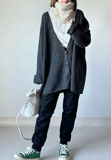 やわらかな肌触りのチャコールグレーカーディガンのインに着ているのは、白のユニクロTシャツ「超極暖ヒートテッククルーネックT」2,990円(155cmでサイズM着用)と黒のユニクロパンツ「ヒートテックボアスエットパンツ」3,990円(155cmでサイズM着用)。シックな配色で大人の女性らしい落ち着いた雰囲気に仕上げています。さらに首元にボリュームのあるユニクロの「ヒートテックファーフリースネックウォーマー」値下げで990円をプラスすることで、防寒対策とおしゃれを両立させています。足元のグリーンのスニーカーをモノトーンコーデの差し色にすることで明るさもプラス。