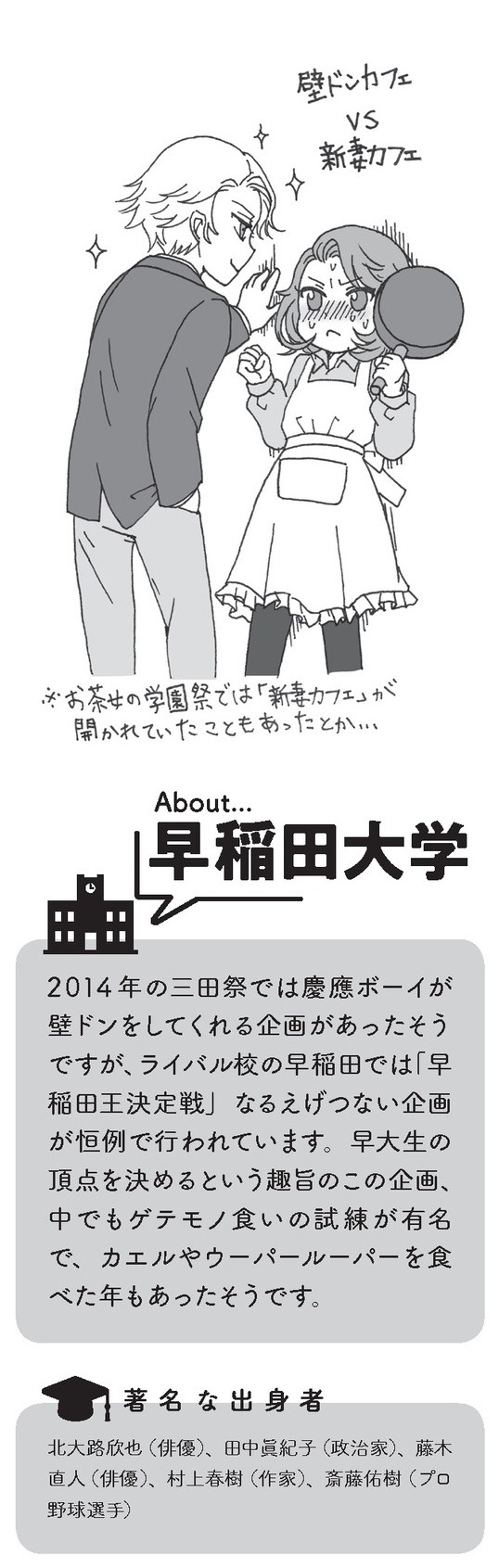 どの大学がどんな“クセ”を持つ? 首都圏・関西の国公立から私立、旧帝・理系・女子大・芸術大まで計70校をユニークに擬人化。ブログで話題を呼んだ連作が大幅加筆&描き下ろし多数で待望の書籍化。志望校や出身校の“あるある”を探してみよう!学風や学部、学食、キャンパス事情まで全方位の“あるある”ネタ満載。受験生も卒業生も楽しめる読み応えの一冊。
