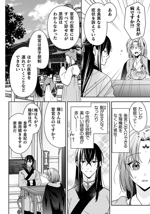 しかし火事が起きて店は消失。食堂の常連で後宮に仕える美しい青年、陽伊鞘に救われるが、彼の頼みで後宮付きの薬膳医になることに。