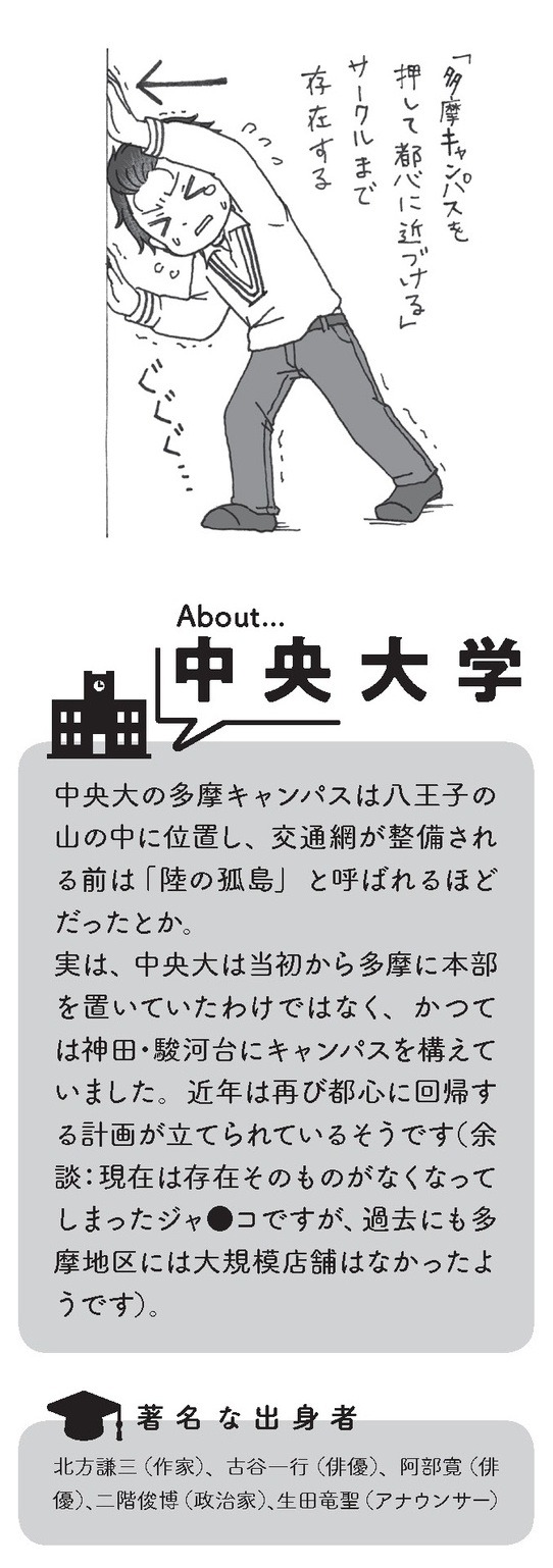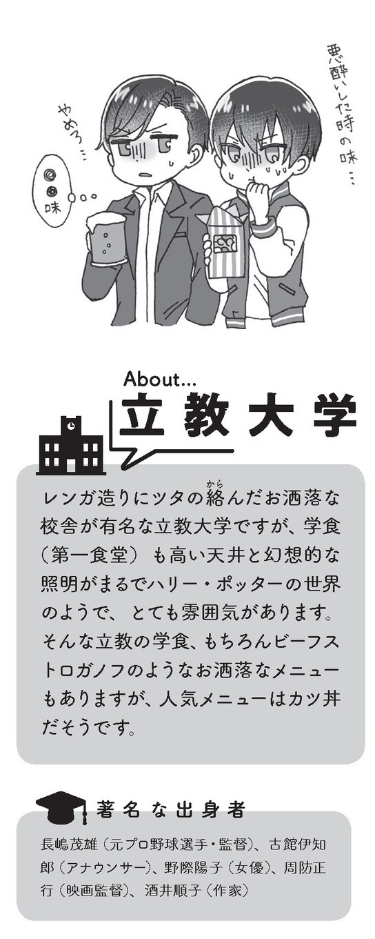 どの大学がどんな“クセ”を持つ? 首都圏・関西の国公立から私立、旧帝・理系・女子大・芸術大まで計70校をユニークに擬人化。ブログで話題を呼んだ連作が大幅加筆&描き下ろし多数で待望の書籍化。志望校や出身校の“あるある”を探してみよう!学風や学部、学食、キャンパス事情まで全方位の“あるある”ネタ満載。受験生も卒業生も楽しめる読み応えの一冊。