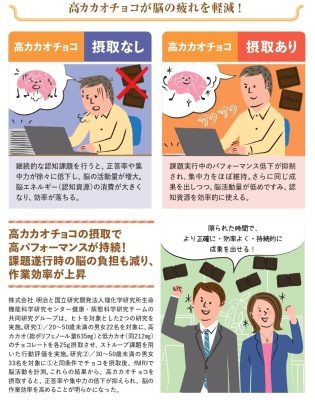 そんななかうれしい報告があります。理化学研究所と明治の共同研究により、「高カカオチョコには、疲れやすい脳を守り効率よく働かせる効能がある」ことが明らかになりました。研究では高カカオチョコと低カカオチョコを摂取し、その後の行動を比較。結果は「高カカオチョコを摂取したあとは、集中力を測る課題でパフォーマンスの低下が見られず、長時間にわたって集中を維持。