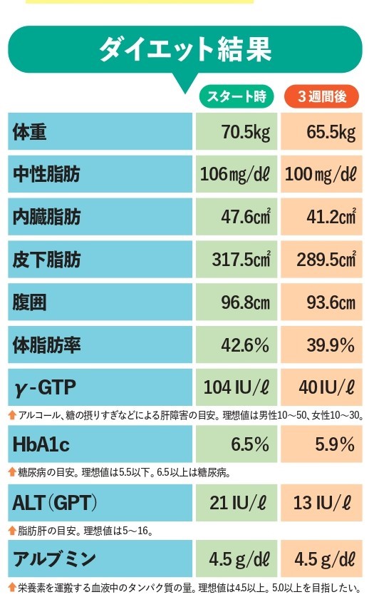 20代後半から30代で20kg近く太り、40代に入って糖尿病を発症。これまでに試したダイエットは数知れず、今回もあまり期待せずに「高カカオダイエット」+「栗原式 ダイエット効果アップの食事術」を3週間実践。食前に必ず高カカオチョコを1枚、小腹がすいたらおやつ代わりに高カカオチョコを1~2枚。大好きな白米の摂取量を減らし、苦手だった肉と卵をよくかんで食べたところ、HbA1cも改善。いかに糖質を摂りすぎていたのかが証明された形になった。