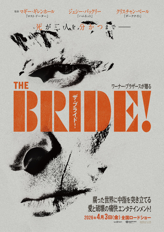 併せてペアティザーポスター2種も同時解禁。クールでレトロなイラスト風のこれらのポスターには花嫁《ブライド》とフランケンシュタインの顔が半分ずつ描かれ、並べるとひとつの顔に見えるようになっており、2人が運命共同体として愛と破壊の逃避行《ハネムーン》に乗り出していくことが示唆されている。『ザ・ブライド!』は2026年4月3日(金)より全国にて公開。