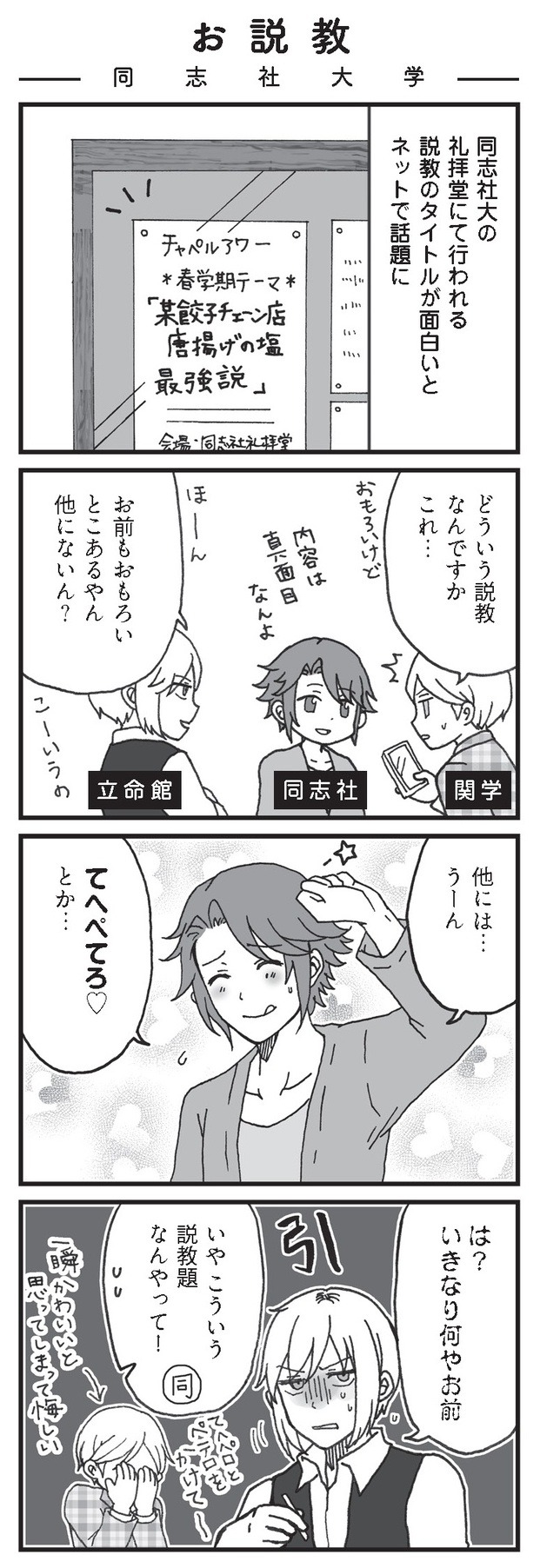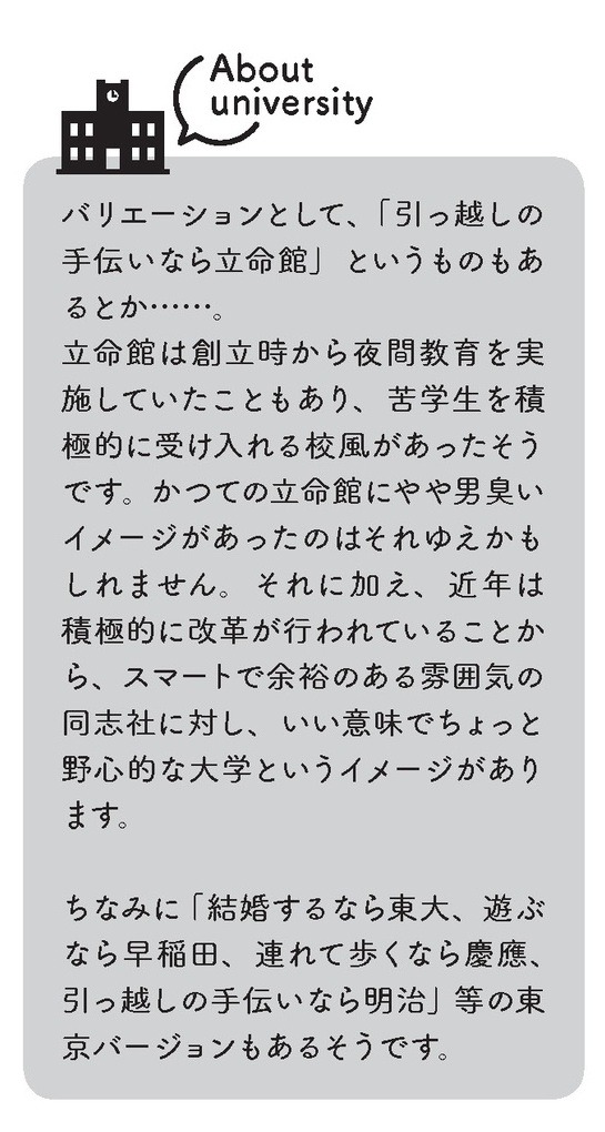 どの大学がどんな“クセ”を持つ? 首都圏・関西の国公立から私立、旧帝・理系・女子大・芸術大まで計70校をユニークに擬人化。ブログで話題を呼んだ連作が大幅加筆&描き下ろし多数で待望の書籍化。志望校や出身校の“あるある”を探してみよう!学風や学部、学食、キャンパス事情まで全方位の“あるある”ネタ満載。受験生も卒業生も楽しめる読み応えの一冊。